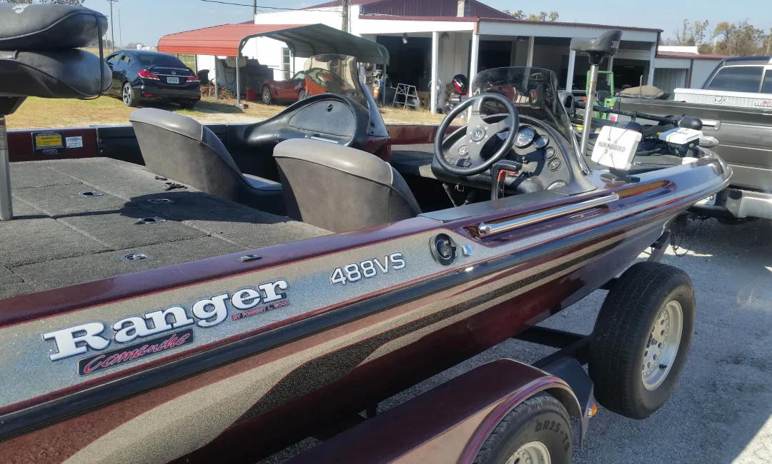 Hard to find boat in really good shape. This 1995 Ranger 488 VS is a great running and great fishing boat. Is equipped with Dual Consoles, Hydraulic Steering, 8″ Rite Hite Jackplate, Stainless Steel Ladder, Minn Kota 80lbs Maxuum Trolling Motor, Humminbird 778 CI DI Console Mount, Lowrance LC-X27 C Bow Mount, Tandem Trailer and a Hamby Heavy Duty Beaching Bumper. Call for More Info.