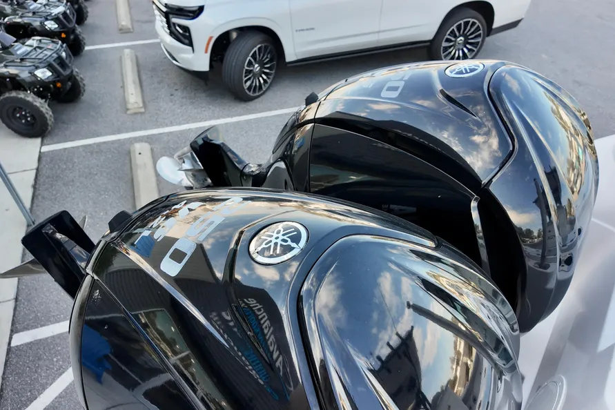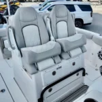 - Fiberglass helm seating pod with deluxe bucket chairs, adjustable armrests, rigging station and cooler storage