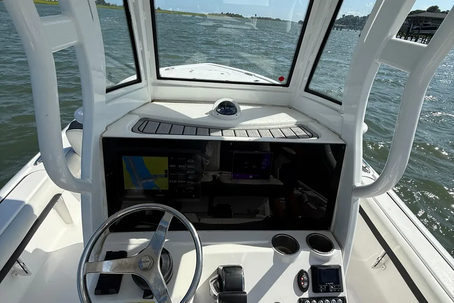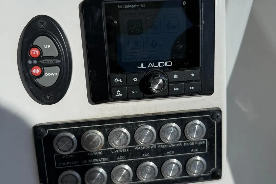 – Garmin 8612XSV GPS/Depth Finder- Full Hard Top with White Powder Coating- Fusion Radio Head Unit- Airmar B75 Thru Hull Transducer- Powder Coated Deluxe Bolster Seat with Rod Holders- 10” Hydraulic Jack Plate- 8’ White Power Pole Blade- Lenco Trim Tabs- leaning Post Tackle Storage- JL Speakers- Swim Ladder and Platform- Saltwater Wash Down- Center Console Storage- Full Forward Seating with Backrest- Pop Up Stern Seating- Stern Livewell- Extra Rod Holders Installed from Stern to Bow- ETC