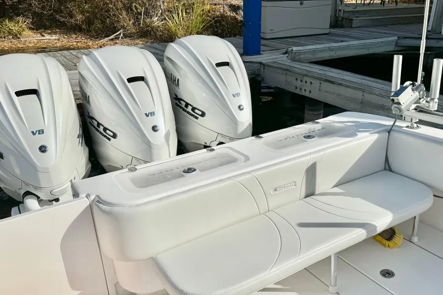 Powered by triple Yamaha 350hp engines, the Contender 39′ fish around is an open water speed demon topping out at over 70MPH. With a standard 460-gallon fuel tank capacity, your boundaries won’t be limited by range.
